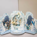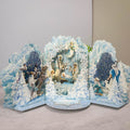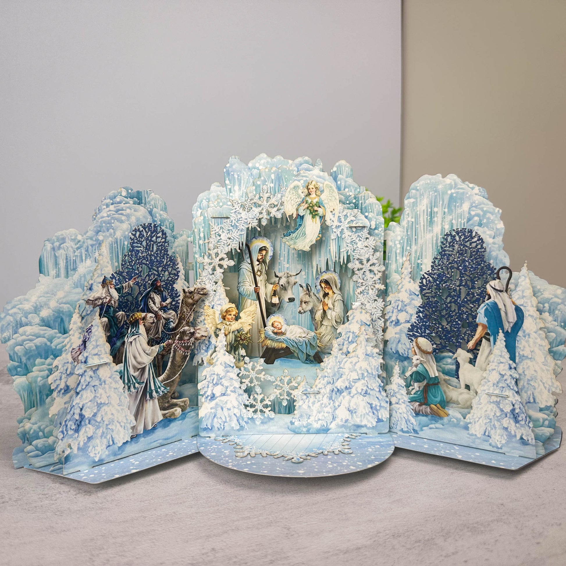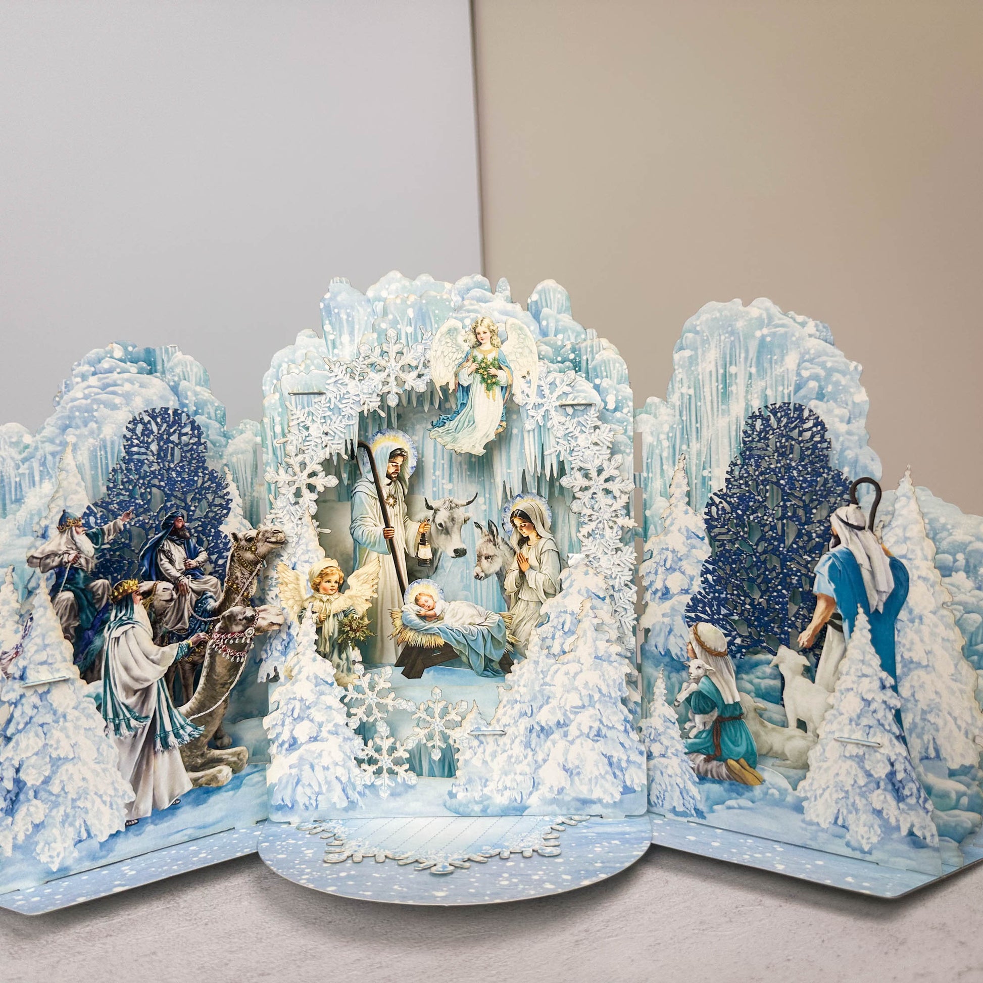 Transform your Christmas greetings with our stunning handcrafted 3D pop-up card featuring a magical Winter Wonderland Nativity scene.